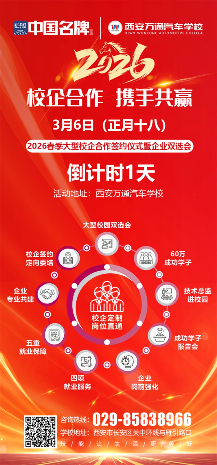 春回大地,万象更新。3月6日,农历正月十八,西安万通汽车学校将隆重举办2026春季大型校企合作签约仪式暨企业双选会。活动进入最后一天倒计时,校园内已准备就绪,静待八方来宾,共襄盛举。