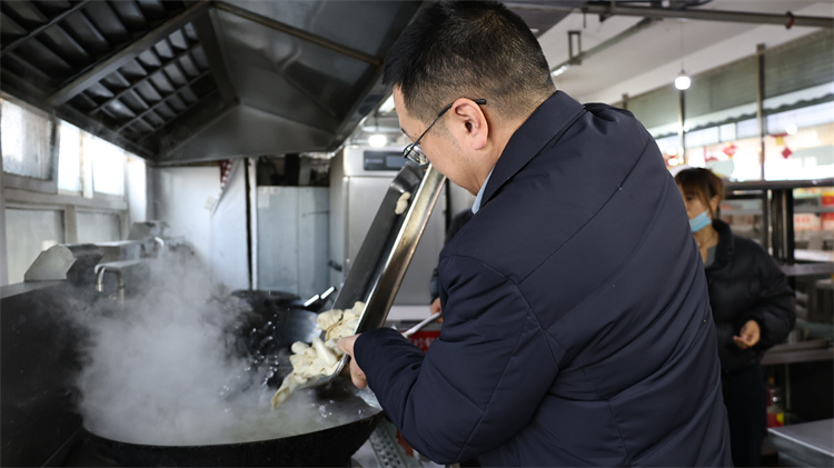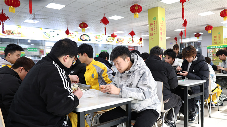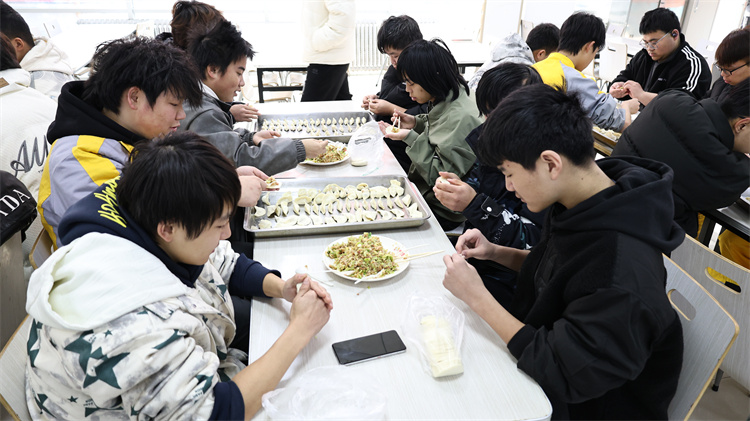 学校食堂内欢声笑语不断。师生们齐聚一堂,分工协作,开始了温馨的包饺子环节。擀皮、包馅、捏边,一系列动作在师生们的手中变得娴熟而充满乐趣。学生兴奋地说:“平时都是和机器打交道,没想到包饺子也能这么有趣。老师还教了我们几种不同的包法,感觉像回到了家里。”