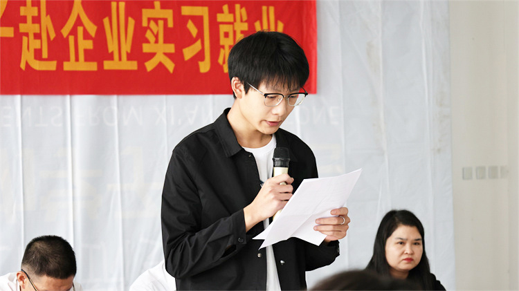 随后,学生代表胡木林森(新能源2302班)上台发言。他表达了对学校与企业提供实习机会的感激之情,并代表全体实习生郑重承诺:将以“空杯心态”投入学习,严守企业纪律,注重团队协作,用实际行动展现万通学子的专业素养与精神风貌。他的发言真挚有力,道出了同学们共同的心声与对未来的坚定信念。