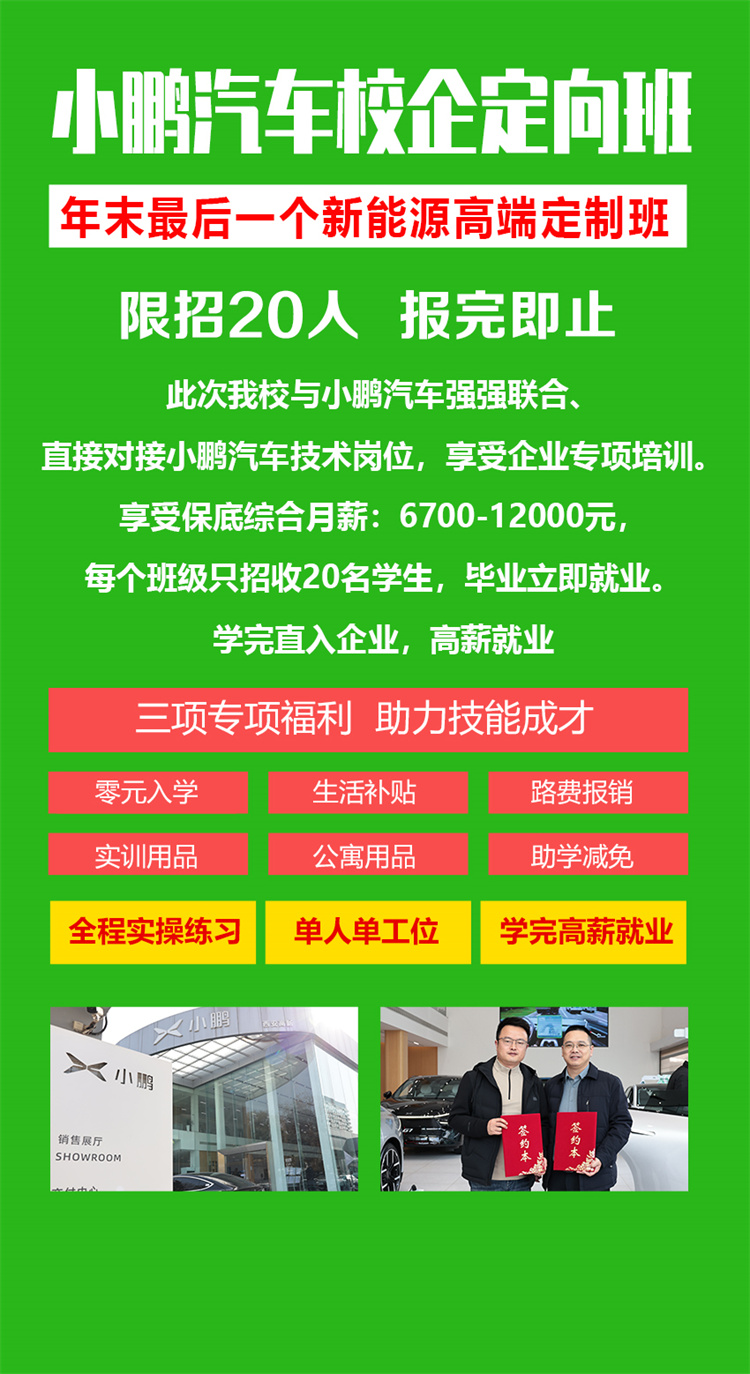 就业保障 :定向输送至小鹏汽车 全国范围内的技术服务中心、生产基地或核心供应链体系 。